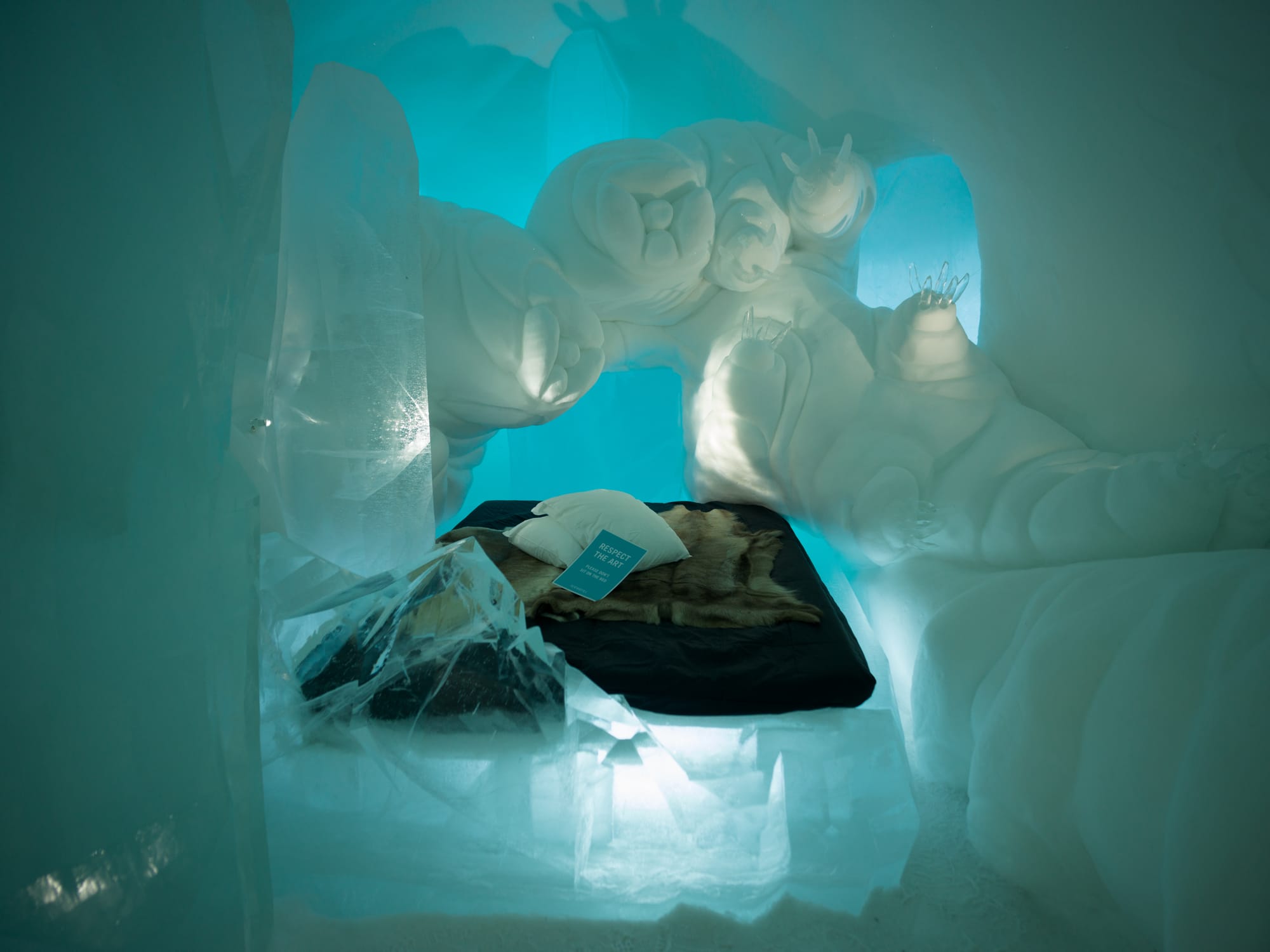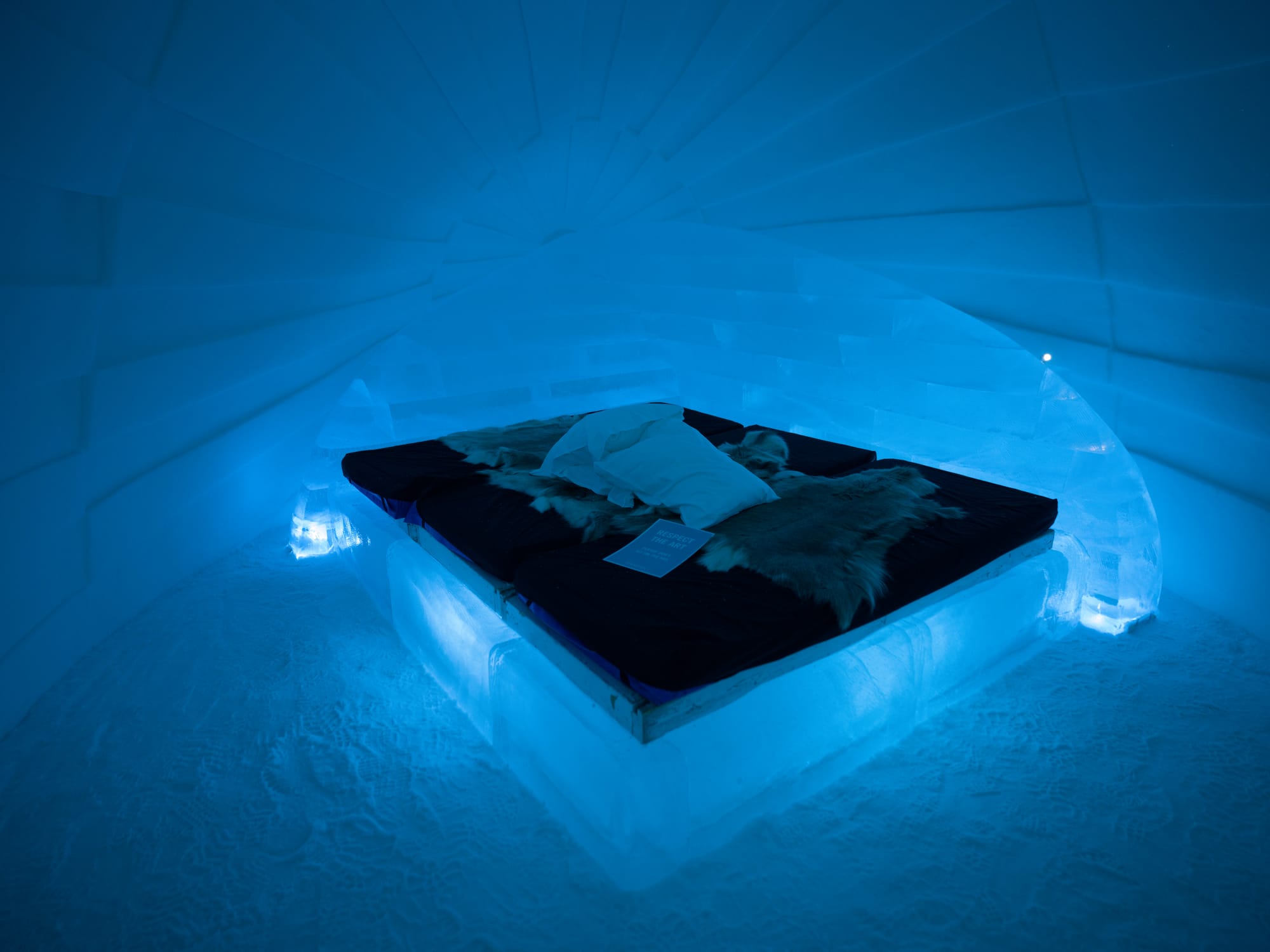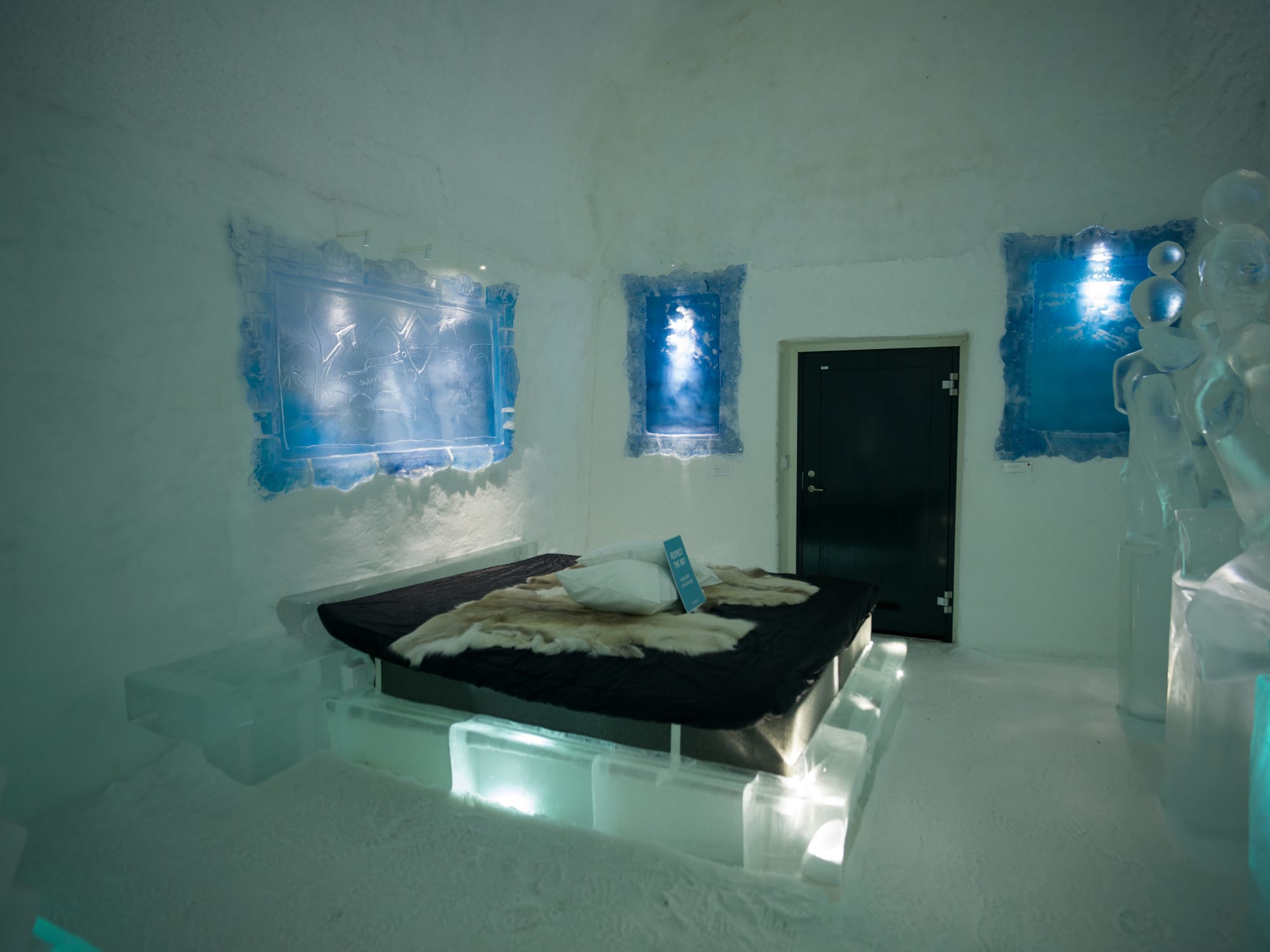 We decided when booking this last year – they we'd be happy to see the rooms but would actually sleep in one of the hotels cozy cabins overnight. The hotel themselves recommend you only stay a maximum of one night in their ice rooms.